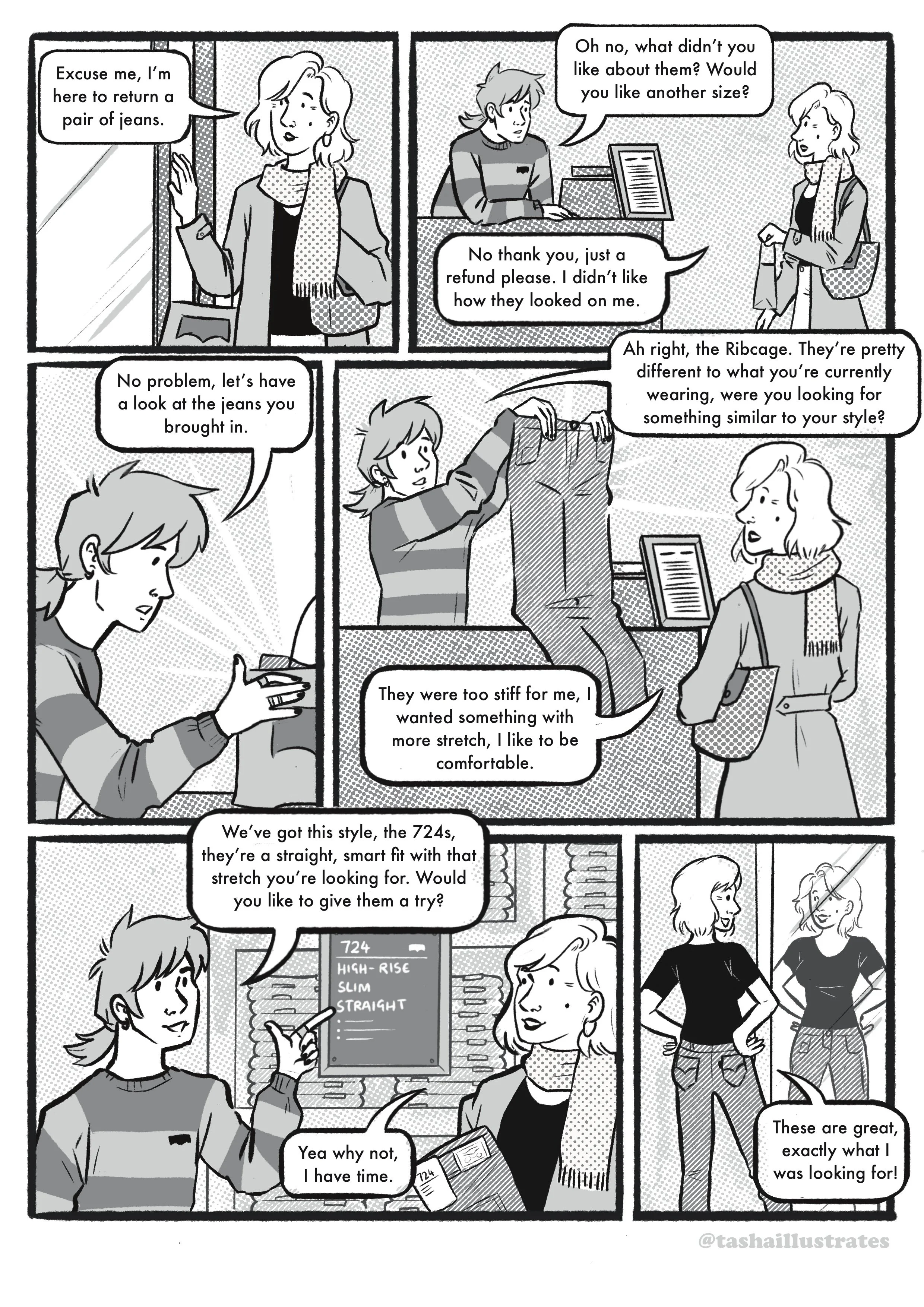 I was commissioned by Levi Strauss and Co. to create some comic pages for staff training purposes. These comics depict an expert stylist showing how to perform certain tasks to Levi’s standard. I made three comics over the course of 18 months.